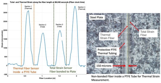 Despite the many advancements in the use of DSS, the use of this system to compute mechanical strain (difference between total and thermal strain) is not a trivial task. Attempts to perform this type of analysis at the same exact point in the fiber would require being able to pinpoint the exact position in the total and thermal fiber section. Although it could be accomplished by pressing both thermal and total fiber segments with a ruler at the same location, as the thermal fiber is free to move during handling, it is possible for the thermal section of the fiber to slide in and out of the PTFE tube during the experimental setup. Attempts by the authors showed that slight differences in the position of the thermal strain point of interest can substantially change the mechanical strain computed. If the position of the thermal strain and the total strain are not at the same location as the plate, it translates into large differences in mechanical strain measurements. Attempt to evaluate mechanical strains at the peaks of the total and thermal strain also resulted in incorrect outcomes. As the fiber optic is freely allowed to move while it is being heated, a shift in position from an initial location can result in large variations. The fiber optic can capture a strain measurement every 0.65 mm. Initial attempts to subtract the thermal strain from the total strain resulted in large variations in the results depending on which point within the fiber was taken.