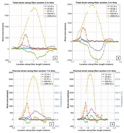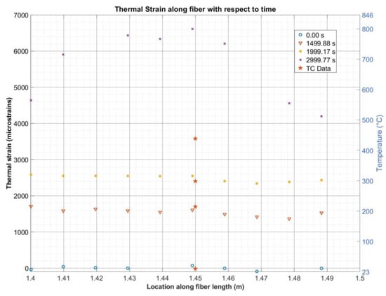In order to validate the performance and accuracy of the fiber optic sensor, a steel plate with a thermocouple and a fiber optic sensor embedded in a PTFE tube was inserted into an oven and heated to approximately 500 °C. Figure 9 shows the fiber optic thermal strain with its corresponding secondary y-axis showing the equivalent temperature measured by the FODSS. The star symbols at the 1.45 m position represent the temperatures measured by a K-type thermocouple. This figure shows how at zero seconds, the thermocouple measures room temperatures (23 °C) coinciding with a fiber optic temperature measurement. This process was repeated at 1500 s and 2000 s. At both times, the thermocouple and fiber optic measurements matched. However, at approximately 3000 s from the initiation of the experiment, the thermocouple read approximately 444 °C, while the fiber optic sensor predicts the measurement by approximately 350 °C. This is indicative of Prof. Bao’s statement that at higher temperatures above 250 °C, the fiber optic distributed sensor is unable to capture the correct temperature measurement. It is important to note that this over-prediction is not from the inability of the LUNA distributed sensing system but rather the use of a Teflon tube as a protective sleeve whose primary objective is to allow the free movement of the internal fiber due to temperature changes. The PTFE tube constrains the fiber optic sensor. Thus, the actual measurement at any temperature above 250–300 °C is a combined thermal and mechanical strain measurement.