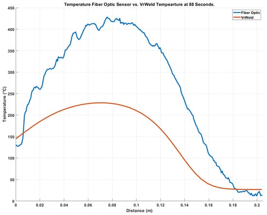 Figure 7 shows the temperature profile along Section 1 at 88 s. A comparison between the VrWeld predicted temperature and the fiber optic sensing data shows large temperature differences (approx. 200 °C) at this time step. The experimental team at Clarkson University and the CWM team at Goldak Technologies Inc. had many discussions on what was causing these differences. After many simulations and iterations (over 2 years), the authors came across an article by Prof. Xiaoyi Bao []. This led to direct communication with Prof. Bao on the use of distributed FOS for temperature measurements. Prof. Bao recalled a non-published experiment in which she encased a fiber optic in a PTFE tube which was subsequently encased in a heated quartz tube. The result of that experiment showed how the PTFE tube expanded and broke the quartz tube. Based on this experience, it was hypothesized that because PTFE has a high coefficient of thermal expansion, it could expand at high temperatures over constraining the polyamide fiber, leading to an overestimation of the temperature measurement. In our study, the PTFE tube was encased in the ceramic Resbond 904 adhesive, as such it was hypothesized that hydrostatic strain formed due to the PTFE tube expanding at high temperatures. Prof. Xiaoyi Bao’s conjecture is consistent with the temperature measurement along the fiber optic sensor. At lower temperatures (Figure 7) the measured and predicted temperatures agree while at higher temperatures when the PTFE expands, the measured temperatures are as much as 1.9 times higher than the temperatures predicted by VrWeld.