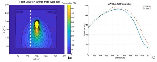To validate Prof. Bao’s statement, the authors of this study made an additional comparison utilizing the FLIR One Pro camera located at the back of the plate with the temperature field computed by VrWeld. A quick evaluation of the VrWeld model indicated that the temperatures at the front and back of the plate were almost identical, as the plate was only 6.5 mm thick. Figure 8a shows the thermographic data processed through the FLIR SDK MATLABTM script []. The dashed white line in the figure is indicative of the position of the fiber optic sensor. Figure 8b clearly shows how both the FLIR temperature field at the back and VrWeld data at the front of the plate match very nicely at 76 s. This result is indicative that the thermographic data and VrWeld result are synchronized and produce very accurate results from a temperature gradient and dynamic perspective.