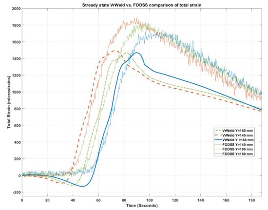 Direct comparisons of the VrWeld total strain measurement and the FOS at the front of the plate are found in Figure 10. This figure represents the longitudinal strain (along the fiber length) at the x-position of 123 mm and y-positions of 140, 160, and 180 mm, as outlined in Figure 8a. A total of three positions along the CWM model and the fiber optic sensor were chosen so as to determine if the overall total strain behavior of the fiber was consistent with the behavior visually captured by VrWeld. In this part of the study, the authors were interested in capturing the steady-state behavior of a manual weld. Figure 10 shows how the LUNA fiber optic total strain reaches close to 1850 µε while VrWeld shows a maximum peak strain close to 1500 µε. The CWM team believes that a 350 µε difference at the peaks is not unreasonable considering the complexity of a manual weldment and the amount of data being analyzed and synchronized for validation. It is also important to note that 200 to 250 µε are equivalent to the clamping of the plate at the corners prior to the start of the weld. It is observable that the total strain gradients between VrWeld and the FOS match very nicely. The shift in the strain as the WP moves up along the plate is also captured, and the strain gradient at the back of the WP also matches closely between VrWeld and the FOS system. An important observation shows that a small compressive residual strain is computed by VrWeld which is not seen by the fiber optic system, which is because the FOS is zeroed out (tared) prior to the commencement of the welding process. This taring of the system is performed as the FOS measures changes in strain due to mechanical and/or thermal loads. It does not measure absolute strain values. In the case of the total strain section of the fiber, this needs to be zeroed due to the hardening of the adhesive, which generates a series of residual strains on the fiber itself. However, in the case of temperature measurement, a thermocouple is used to relate the initial room temperature to zero strain measured by the FOS. The thermal expansion of the fiber is a constant and thus allows us to compute the equivalent temperature for a change in strain. That is how in Figure 9, zero strain on the first y-axis is equivalent to 23 °C on the secondary y-axis, while approximately 2500 µε is equivalent to 300 °C.