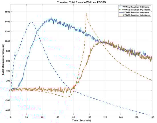 However, despite these achievements, the authors of this study wanted to understand the performance of the FOS during the transient total strain measurements at the beginning and end of the weld, when the arc was being turned on and off, respectively. Figure 11 shows the transient total strain at the start and end of the weld. The results of the FOS were compared to the VrWeld total strain at the same location and time. As observed, the total strain measurement response lags in comparison to the VrWeld results during both the heating and cooling stages when the arc is being turned on and off. At the start of the weld, at a position 60 mm from the bottom of the plate, there was approximately an additional 12 s shift, even though the peaks of total strain are in line and the strain gradients match with those computed by VrWeld. However, at the end of the weld (100 s), the total strain peaks are off by approximately 500 µε. The cooling of the FOS is noticeably consistent at the start and end of the weld, while VrWeld cooling gradients are much steeper. This is in contrast with Figure 10, where both the peaks and the total strain gradients at the front and back of the weld pool are in sync during the steady state condition of the weld. The authors hypothesize that the transient heating and cooling in front and at the back of the weld pool requires further analysis and evaluation by both the CWM and experimental mechanics teams. It is possible that the lack of synchronization during the transient analysis could be a combination of factors on how the strain is transferred to the core of the fiber through the Resbond 904 and the steel plate. The CWM team also agrees that further investigation with millisecond discretization range and high-speed DIC would be required to truly understand the physics during the arc turning on and off.