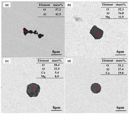Observed oxide inclusions can be categorized into four types: Al2O3 (with Al2O3 ≥ 95%), MgO-Al2O3 (with CaO < 5%), CaO-MgO-Al2O3 (with CaO ≥ 5%, MgO ≥ 5%) and CaO-Al2O3 (with MgO < 5%). The number fractions of various inclusions at different times are shown in Figure 3 and Figure 4. As can be seen, 92% of the inclusions were Al2O3 at LF arrival, which were either in blocky or cluster shapes. Afterwards, the proportion of Al2O3 decreased significantly to about 53%, and the fraction of MgO-Al2O3 inclusions increased rapidly to 34%, which were mainly in irregular spheres. While the fractions of CaO-MgO-Al2O3 and CaO-Al2O3 were below 8%, both of which were mostly in spherical shapes, as shown in Figure 4c,d. After soft blowing, proportions of Al2O3 and MgO-Al2O3 inclusions decreased from 33% and 49% to 29% and 40%, respectively, while the proportions of CaO-MgO-Al2O3 and CaO-Al2O3 inclusions increased from 8% and 10% to 14% and 17%, respectively. In casting tundish, the fraction of MgO-Al2O3 increased to 43%, while the fraction of CaO-MgO-Al2O3, CaO-Al2O3 and Al2O3 increased to 15%, 20% and 22%, respectively.