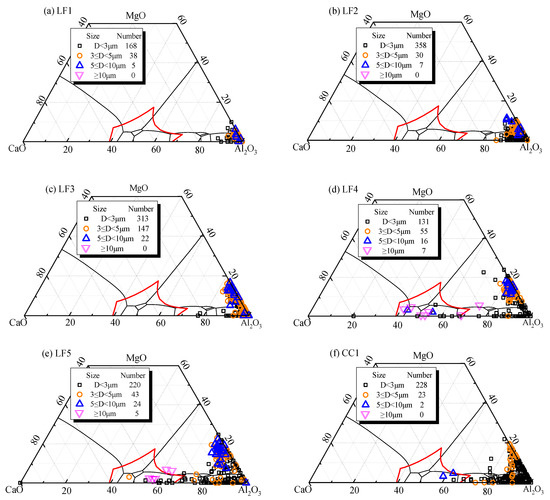 Evolution in the chemical compositions of inclusions in liquid steel. (a) LF1; (b) LF2; (c) LF3; (d) LF4;(e) LF5; and (f) CC1.