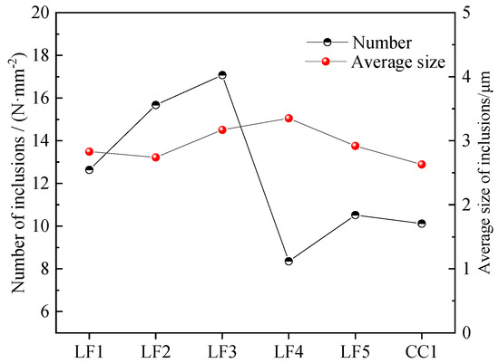 Figure 6 shows variations in the quantity and size of inclusions. It can be seen that at LF arrival, the number density of inclusions was about 13/mm2, with an average size of about 2.8 μm. Afterwards, the number density of inclusions reached a maximum of 17/mm2, which could be related to more intensive argon gas bottom bubbling of ladle to promote desulfurization. Then, the number density of inclusions decreased sharply to 8/mm2. However, the average size of inclusions slightly increased to 3.4 μm. At LF departure, number density of inclusions was 11/mm2, about 2/mm2 higher than that before soft blowing. Additionally, the average size of inclusions was 2.9 μm, which was a little lower than that before soft blowing, indicating that soft blowing was favorable to the floatation of large inclusions. In the tundish, the number density of inclusions was about 10/mm2, which was slightly lower than that of LF departure. While the average size of inclusions was 2.6 μm, about 0.3 μm smaller than that at LF departure.