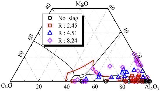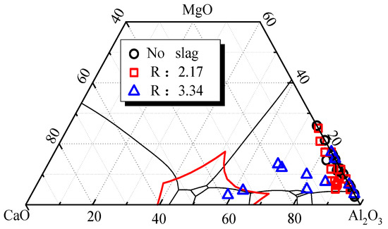 Contents of CaO, MgO and Al2O3 in CaO-MgO-Al2O3 inclusions.