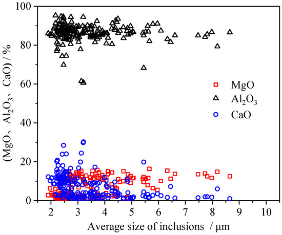 With regard to the modification of MgO-Al2O3 into CaO-MgO-Al2O3 or CaO-Al2O3, previous studies showed that the transformation of MgO-Al2O3 would proceed from the surface to the inner center, in which the rate-controlled step was the diffusion of Ca and Mg in the intermediate reaction layer [27]. In this study, variations of CaO, MgO and Al2O3 contents in inclusions were observed, their sizes shown in Figure 9. As can be seen, higher CaO contents and lower MgO contents were observed in small inclusions. By contrast, lower CaO contents and higher MgO contents were observed in large inclusions. It implied that the modification of larger MgO-Al2O3 inclusions needed a much longer time, which was justifiable and consistent with previous findings.