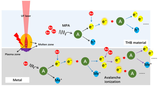 UF laser microwelding of THB materials and THB material–metals belongs to a processing regime associated with extremely high light intensity. This takes full advantage of nonlinear absorption and the significantly rapid heating and cooling characteristics of UF lasers to realize microwelding by localized heat injection [25]. It is reported that, when most THB materials are illuminated by a traditional laser with VIS-NIR bands, confined electrons inside the materials cannot be excited via linear absorption to jump into the conduction band due to its intrinsic colossal bandgap [26]. Interestingly, when an UF laser with high peak power is focused on the interface of two THB substrates, the intensity in the focal volume is sufficiently high to excite nonlinear absorption through multiphoton ionization and tunneling ionization, achieving the band gap transition of valence band electrons [27,28,29,30,31]. These excited, high-energy electrons further absorb photons and then, as seed electrons, can produce more free electrons through inelastic scattering, as shown in the upper part of Figure 1. This ionization process through electron collision is prone to develop into a chain reaction and then provides plenty of free electrons to the system, which is called avalanche ionization [26,32]. Half of the electrons which generate in the processes of multiphoton and avalanche ionization are reported to be immediately photoemitted from the surface and below-surface region [33]. Nevertheless, sufficient free electrons remain to be continuously accumulated at the interface by means of complex electronic transport, which creates electrostatic stress and thus initiates the Coulomb explosion. These charge dynamics of irradiated materials by UF laser are strongly associated with the absorption characteristics for each of the materials (metal, dielectrics and semiconductors) and eventually result in the formation of a high-density plasma that is localized in a small focal volume. The high-temperature plasma transfers the electron energy to the material lattice through electron–phonon coupling. The material in the vicinity of the plasma region melts or even evaporates due to thermal diffusion. Subsequently, plasma mixing and cooling, accompanied by irreversible thermal expansion of the melt, occurs at the interface around the focal volume [15,34]. After resolidification, the two substrates will be joined together.