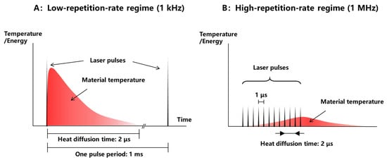 Energy deposition behaviors at (A) a low repetition rate (e.g., 1 kHz) and (B) a high repetition rate (e.g., 1 MHz).