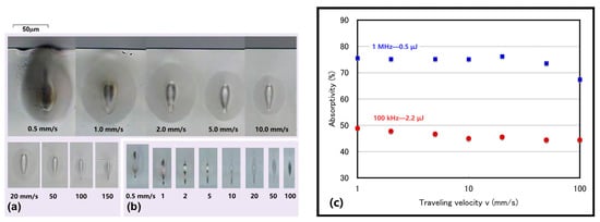 (a) Cross sections of irradiated borosilicate glass with femtosecond laser at different traveling velocities and repetition rates. (a) 1 MHz–0.5 μJ and (b) 100 kHz–2.2 μJ; (c) Nonlinear absorptivity of borosilicate glass dependent on traveling velocity. Reprinted from Ref. [38] with permission of Elsevier, 2016.