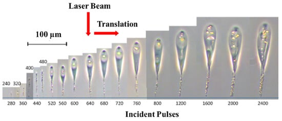 Ascribed to Jee’s incubation model, the ablation threshold decreases with the number of applied pulses [42]. Pulse number directly determines the amount of energy injected and its corresponding type of material modification, eventually influencing the joint formation and fusion behavior at the material interface. Chen et al. [43] presented the evolution of the plasma region and melt zone with increasing incident pulses in the fused silica glass sample in order to improve the understanding of UF laser microwelding of THB materials (see Figure 4).