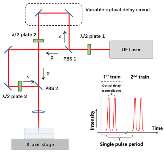 The influence of the introduction of extra pulses (i.e., pulse train/burst mode) on THB material microwelding was also studied. Sugioka et al. [47] achieved microwelding of glass substrates using a pulse train consisting of two pulses with controllable delay time resulting from the laser temporal shaping technique, as shown in Figure 5. The results indicated that the utilization of a double-pulse train for glass welding enabled improvement in the efficiency of electron excitation and laser absorptivity, thus resulting in a higher welding velocity. With an optimized repetition rate and number of pulses in the burst, not only did this process produce a comparably large molten volume at a regime of lower applied power, but it also induced less stresses [48], which explained well the higher bonding strength of the sample prepared by a double-pulse train than that of irradiation with a conventional single-pulse train.
