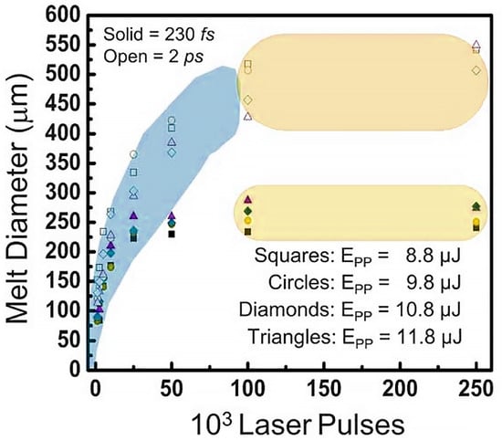 As for the UF laser, its lower pulse duration allows for better energy deposition efficiency and weld quality, despite an attenuated welding velocity, which can be overcome by process optimization. Interestingly, with the pulse duration down to the picosecond range, the thickness of melting and the recast layer cannot be reduced to zero value even if the pulse duration is further reduced, due to the apparent optical distortion effects [42]. With a careful balancing of the influence of pulse width on the weld quality and welding efficiency, a picosecond laser can be an optimized tool for joining the THB materials. Figure 6 details the melt diameter as a function of the number of incident pulses for both femtosecond and picosecond lasers. For the same number of pulses, the pulse duration in the picosecond regime had a better energy coupling and thus led to a relatively sizeable molten region. This means that picosecond lasers have a larger, effective processing window and, because of the larger melt zone, this method is capable of joining samples with non-ideal matching (e.g., non-optical contact condition). This could simplify the sample pre-treatment procedures and improve welding efficiency. Notably, this advantage was more significant at a relatively large number of incident pulses.