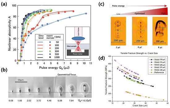 (a) Dependence of simulated and experimental nonlinear absorptivity of glass sample on pulse energy for different pulse repetition rates, reprinted from Ref. [25] with permission of Springer, 2013; (b) Cross sections of corresponding welded samples at constant pulse repetition rates (50 kHz) and different pulse energies, reprinted from Ref. [25] with permission of Springer, 2013; (c) Morphology of quartz wafer weld seams with different pulse energies, reprinted from Ref. [22] with permission of MDPI, 2019; (d) Fracture strength as a function of crack size of borosilicate glass weld samples at different laser energies, reprinted from Ref. [53] with permission of ASME, 2015.