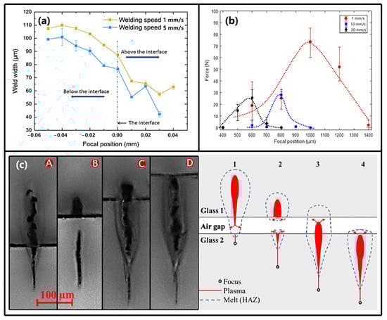 (a) Dependence of weld width of silicon-glass on focal position for scanning speed of 1 and 5 mm/s, reprinted from Ref. [57] with permission of Elesiver, 2019; (b) Dependence of bonding strength of fused silica glass on focal position, reprinted from Ref. [55] with permission of ASME, 2019; (c) Cross-sections and schematic diagrams of joined glass substrates by picosecond laser at different focal positions, reprinted from Ref. [43] with permission of Optica Publishing Group, 2015.