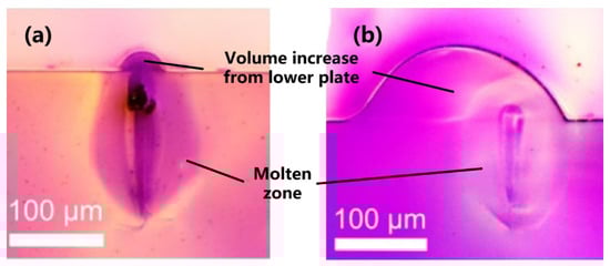 Interestingly, it is observed in Figure 8a,b that, with the increase in pulse energy, an upward shift of the modified region occurred and excessive pulse energy even led to the ablation on the upper surface and the resultant plasma, consistent with the observation of Yu et al. [54]. This was due to the generated plasma, which effectively prevented the downward propagation of laser energy through the inverse bremsstrahlung absorption of plasma. This enabled the plane in the upper glass substrate, corresponding to the nonlinear absorption threshold, to continuously approach the laser source. With the increase in pulse energy, this effect was more intense and the modified zone moved further away from the focal plane, which was harmful to achieving a successful weld joint at the interface between two substrates. Hence, it is necessary to achieve a strong bonding through a synergy of multiple welding parameters [7,19].