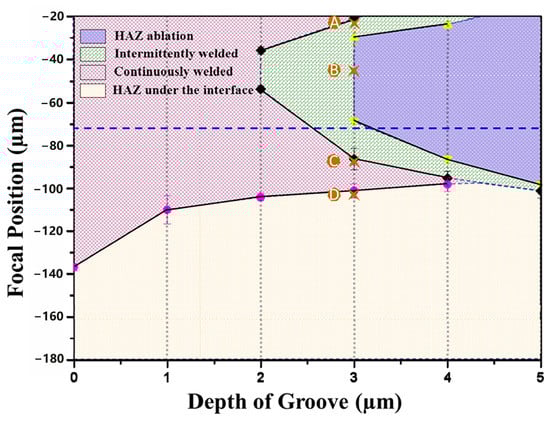 Nevertheless, the introduction of a gap between two substrates brings complexity to the positioning of the laser focus and then affects the resultant interface bonding. Chen et al. [34] investigated the viability of welding glass across a gap with a picosecond laser at different focal depths. Figure 13 shows a parameter mapping as a function of gap depth and focal position with a fixed pulse energy of 18.23 μJ and traveling speed of 2 mm/s. It found four types of weld results after welding across a gap as the focal plane and gap distance change: HAZ ablation, intermittently welded, continuously welded and HAZ under the interface.