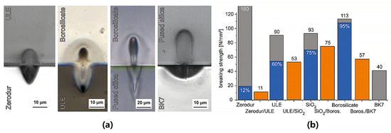 (a) Cross section of the heterogeneous weld joint of four glass combinations; (b) Breaking strength of welded glass samples, where the gray bars detail the breaking strength of the base material, the blue bars represent the bonding strength of homogeneous glass weld samples and the orange bars identify the welding results of dissimilar glass combinations. Reprinted from Ref. [64] with permission of Springer, 2012.