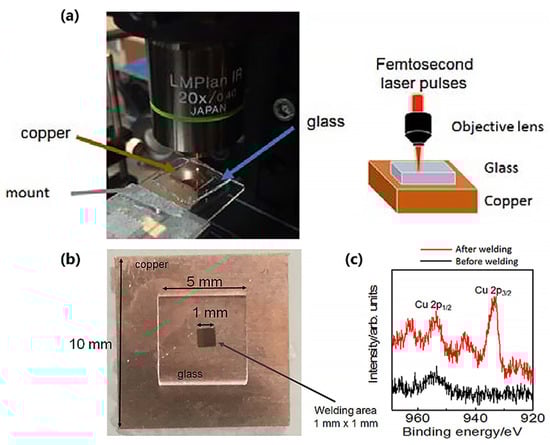 (a) Image and schematic diagram demonstrating the joining of a glass substrate to the copper plate with a rough surface by UF laser without a fixture; (b) Welded Cu–glass sample; (c) XPS spectra on the cleaved glass surface after microwelding. Reprinted from Ref. [27] with permission of JLMN, 2018.