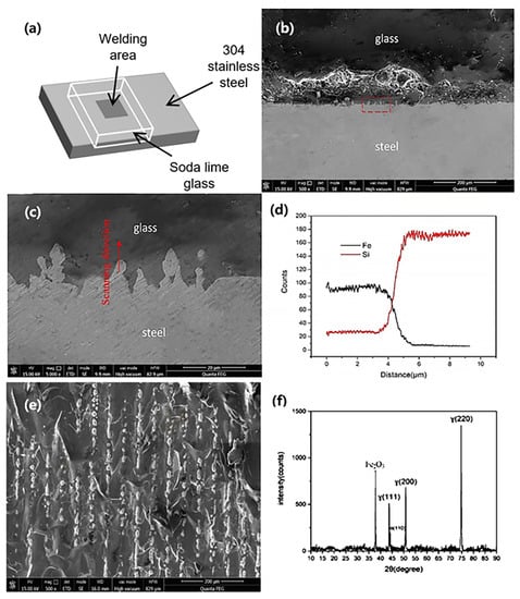Wang et al. [35] carried out 304 stainless-glass microwelding by a high-repetition-rate femtosecond laser as shown in Figure 17a and then conducted SEM characterizations for the resultant joint. An asymmetric molten zone is observed in Figure 17b and the melt on the glass side is much larger than that on the metal side. In Figure 17c, it was found that an indented interface caused by the encroachment of two molten materials occurred, which acted as a mechanical interlock to bring the two substrates together. However, for lack of further chemical component analyses, the EDS results only show the presence of a very small amount of element diffusion, as shown in Figure 17d, but insufficiently identify the special reaction products and phase composition. The author therefore argued that it was mechanical bonding rather than chemical reaction that was the joining mechanism of stainless steel and glass by fs laser irradiation. However, the analysis of fracture surface found that iron oxide was formed at the fracture surface of stainless steel, apart from the wrapping of remelted glass and convex stainless steel particles, as shown in Figure 17e,f. Wang et al. explained that the oxygen element in iron oxide was derived from the air in the gap between two substrates, which needed to be further explored, excluding the possibility of an iron element in steel bonding to oxygen in glass.