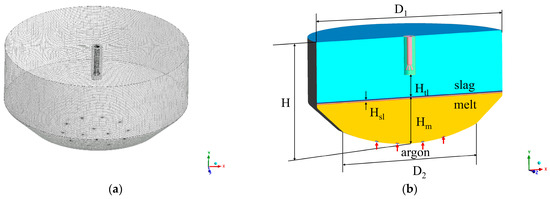 As depicted in Figure 1, a geometric model of the 335 t top-bottom combined blowing converter has been developed. The model is established by combining the six-hole top spray lance with 14 bottom nozzles distributed in two dimensionless interval circles. To reduce resource pressure and shorten the calculation time, only the lower part of the converter is simulated, that is the fluid domain containing the spray lance outlet to the bottom of the molten bath.