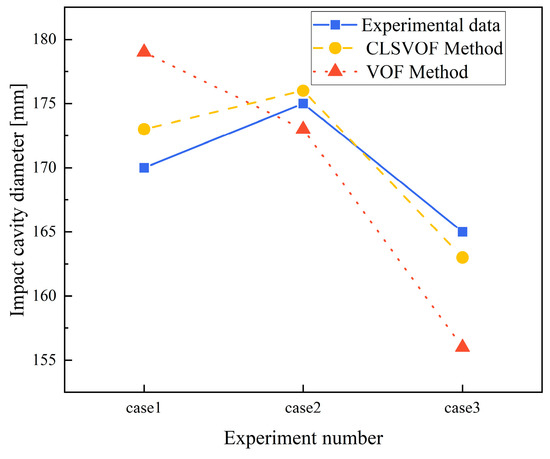 The CLSVOF mathematical model is validated using the water model experiment data in reference. This method greatly improves the accuracy of interface capture. In order to verify the accuracy of this method, we choose the experiment [36] of measuring the impact cavity size. In this experiment, water and air are used to represent liquid steel and nitrogen, respectively. The model has a geometric ratio of 1:10 with respect to the 210 t converter prototype. It is made of organic glass and includes a bottom-blowing device with an aperture and an aqueous solution. Air is forced into the molten bath from both the top oxygen lance and the bottom-blowing device at a specified flow rate. This paper investigates the impact cavity diameter under varying top-blowing flow, bottom-blowing flow, oxygen lance height, and oxygen lance inclination when the injection process is stable. The impact cavity diameter simulation outcomes are contrasted with experimental data that is most precisely predicted using an optimized CLSVOF. Experimental conditions are shown in Table 3. The results are shown in Figure 2.