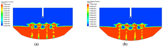 However, it is important to note that there are still some conflicting issues when using the VOF method to describe the multiphase flow of the top-bottom-blowing converter. Specifically, the VOF method can result in errors [13,14,15,16] when calculating complex deformation interfaces.