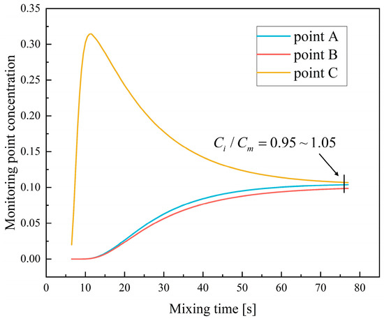 As the control variable, the tracer position is below the liquid steel level and fixed at the converter axis. At the same time, the diffusion coefficient of the tracer in each phase fluid remains unchanged, and three representative concentration monitoring points are set up in the converter. The coordinates are point A (−3500 mm, 900 mm, and 0 mm), point B (0 mm, 900 mm, and −3500 mm), and point C (0 mm, −450 mm, and 0 mm), as shown in Figure 5.