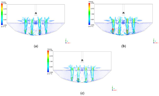 The velocity vector under different top blow flow rates: (a) 0.252 kg/s; (b) 0.347 kg/s; (c) 0.379 kg/s.