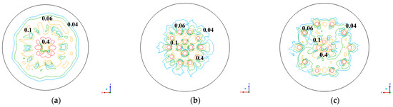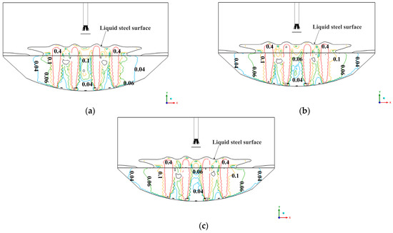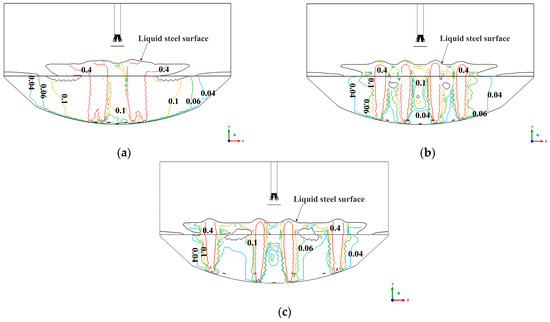 Figure 12 reveals that the inner and outer pitch circles are in close proximity. Consequently, the rising gas column gets compressed by the molten steel in the molten bath. On the other hand, air columns on various pitch circles result in more concentrated and powerful gas columns that aid in the circulation and homogenization of the molten metal. When the inner and outer nozzles are positioned close to each other, the bottom-blowing gas column generates a stronger lifting force, which prevents the formation of a flow dead zone.