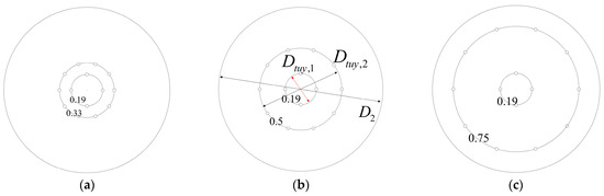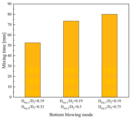 The arrangement of bottom-blowing modes with Dtuy,1/D2 = 0.19 and Dtuy,2/D2 = 0.33 maximizes the lifting effect on the liquid metal due to the proximity of the gas columns, resulting in a clear annular vortex shape for optimizing stirring in the molten bath with a mixing time of 52.5 s in Figure 15. In general, the mixing time increases gradually as the distance between the inner and outer nozzles increases. When the outer nozzle element is positioned further away from the converter axis and closer to the wall surface, that is, Dtuy,2/D2 = 0.5, the gas column divides the molten bath into several regions and resulting in a mixing time of 73.5 s. However, when the outer gas column collides with the converter wall at an excessive distance, it causes energy loss, resulting in a reduced flow rate in the middle and lower parts of the molten bath. Additionally, there is a lack of stirring effect, which increases the mixing time by 80 s. Moreover, if the distance is too close, it will isolate the inner and outer molten regions and make it difficult to mix the molten bath. Conversely, when the distance is too long, the low-speed area in the middle and lower part of the molten bath becomes large, and the circulation flow is poor, leading to a prolonged mixing time.