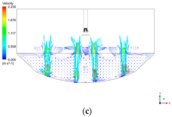 The velocity vector under difficult bottom-blowing modes: (a) caseA; (b) caseB; (c) caseC.