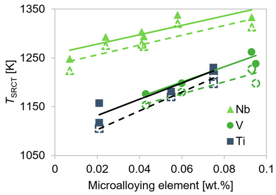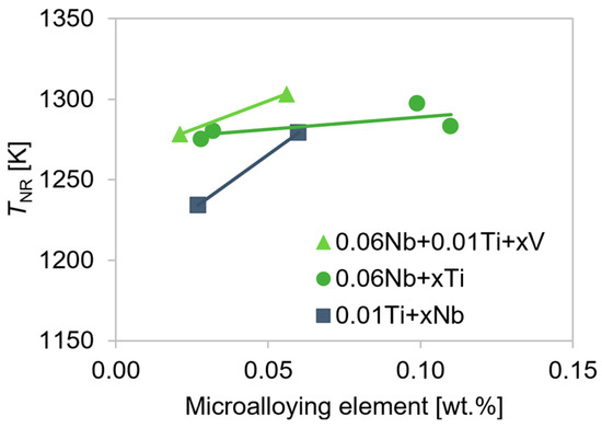 Impact of varying contents (x) of microalloying elements on TNR of microalloyed steels for deformation to φ = 0.2 and intermediate holding time of 5 s [25,27]. Lines are guides to the eye.