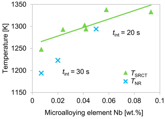 Figure 3 displays experimental TNR and TSRCT values of Nb microalloyed steels from the literature [16,19,22,33,34,35]. It shows that the non-recrystallization temperature reaches lower values compared to the TSRCT at longer interpass times, independently of microalloying.