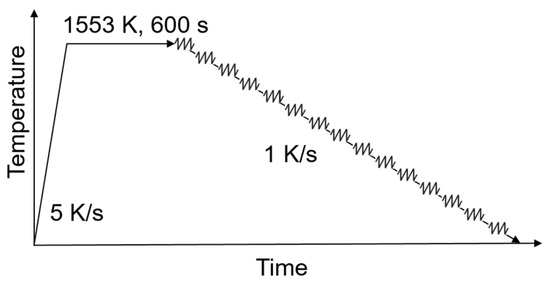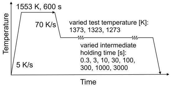 Hot torsion tests with continuous cooling are performed on all five steel grades using the hot torsion mobile conversion unit of the Gleeble® 3800 thermo-mechanical simulator. The experimental setup is similar to the one of the DHT but torsion tests demand for a more complex sample shape with 165 mm length, a diameter of 10 mm at the center, and a diameter of 14 mm at the borders. The specimens for the experiments are solution annealed at 1553 K for 600 s, followed by constant cooling from 1553 K with 1 K/s. During cooling, the samples undergo deformation consisting of 15 passes with 0.3 equivalent strain and a strain rate of 2 s−1. The strain of 0.3 is not sufficient to produce dynamic recrystallization; therefore, the examination of static recrystallization can be focused on. The interpass time between the individual torsional loads is 30 s. The schematic rolling pattern for the torsion tests is illustrated in Figure 5.