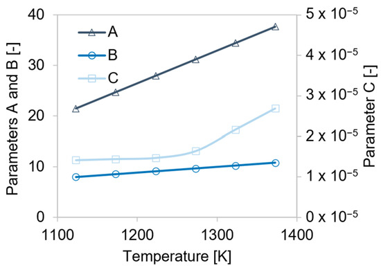 Previous research by the authors [36] revealed that the dislocation density evolution (Equation (9)) for microalloyed steel can be reasonably well approximated by using the temperature- and strain rate-dependent parameters A, B, and C, depicted in Figure 6.