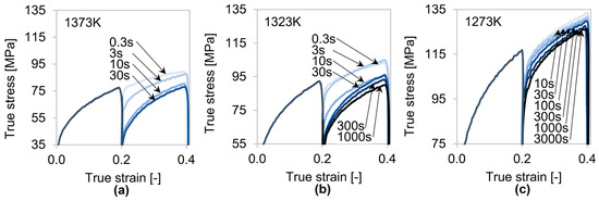 Flow curves of steel grade S5 during isothermal DHT with varying deformation temperatures and intermediate holding times. (a) 1373 K, 0.5 s−1, 0.3–30 s; (b) 1323 K, 0.5 s−1, 0.3–1000 s; (c) 1273 K, 0.5 s−1, 10–3000 s.
