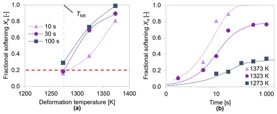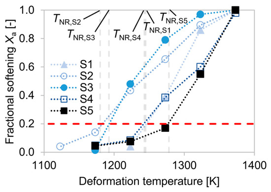 By plotting the fractional softening as a function of time, the TSRCT can be evaluated. At the TSRCT, as well as below this temperature, the slope of Xa against time decreases [19]. A plateau is formed at lower temperatures, which indicates the deformation-induced precipitation of MX particles [25] and the retardation of recrystallization. Above the TSRCT, no impediment of recrystallization due to precipitation of (Nb/Ti/V)(C,N) takes place.