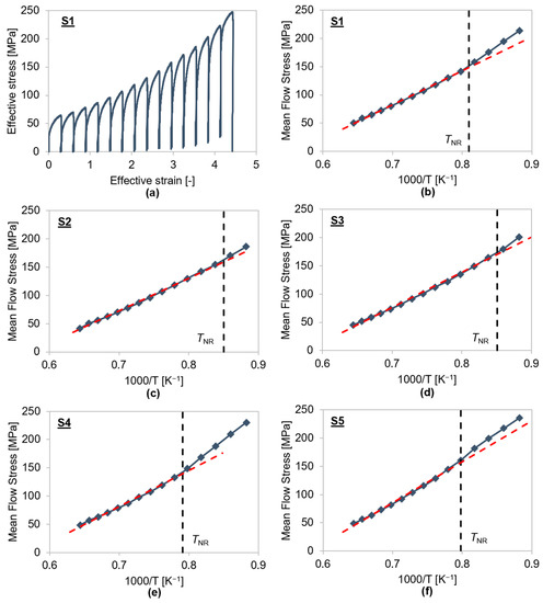 Stress–strain curves of steel grade S1 (a) and dependence of MFS on inverse absolute temperature for steel grades S1–S5 corresponding to a 15-pass torsion sequence (b–f). Lines are guides to the eye.