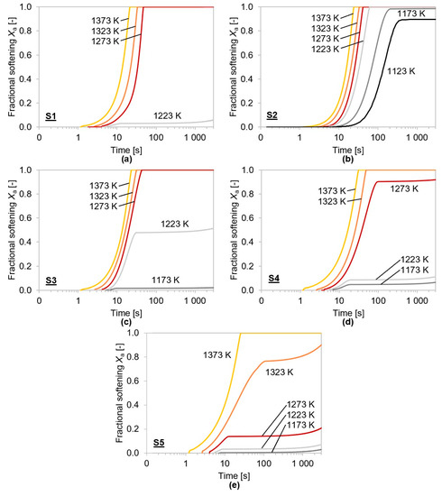 Effect of deformation temperatures on softening fractions of steel grades S1–S5, (a–e), derived from simulated isothermal compression tests with 0.5 s−1 strain rate up to 0.2 strain.