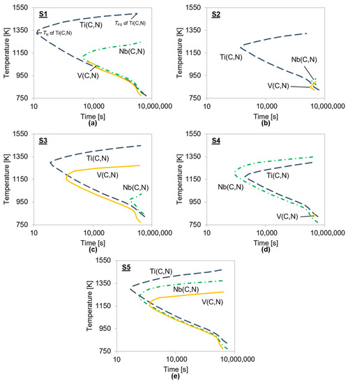 Computed TTP curves for 5% precipitated fraction of individual MX phases for alloys S1–S5, (a–e).