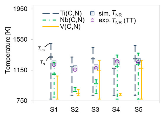 In Figure 13, the TPS and TN of the individual MX phases from simulated TTP curves and the TNR from simulated compression tests are compared to the experimental TNR from hot torsion tests. The evaluated non-recrystallization temperatures are in the range of TN, where the peak of microalloy carbonitride precipitation is located. This indicates sound simulative thermokinetics of MX precipitation, since it is expected that the impediment of recrystallization is governed by grain boundary pinning by MX phases [5]. Due to the low solubility of Ti(C,N) in austenite, this phase is observed at higher temperatures than Nb(C,N) and V(C,N) [36]. Thus, microalloying of titanium is highly effective for grain boundary pinning by individual MX phases at elevated temperatures. Only in alloy S4 does the formation of Nb(C,N) start at a higher temperature than Ti(C,N) due to the much lower content of Ti in comparison to Nb.
