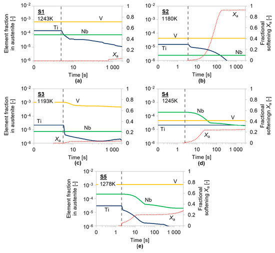 Atomic fraction of microalloying elements in austenite (continuous lines) and softening fraction of austenite (dotted lines) during compression tests at respective simulated TNR of the alloy S1–S5, (a–e). The vertical dashed lines indicate the start of deformation with 0.5 s−1 strain rate to 0.2 strain.