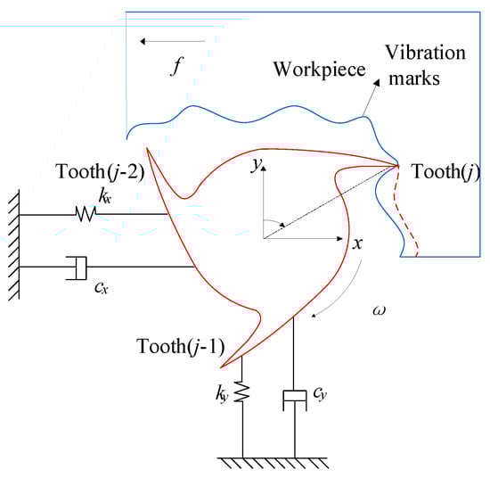 Assuming that the workpiece and the milling tool are rigid and flexible, respectively, a simplified mass-damping-spring model with two degrees of freedom (DOF) can be used to describe the dynamic milling process, as shown in Figure 1. In consideration of the regenerative effect, the mathematical model can be expressed as a second-order delay differential equation (DDE) as follows []: