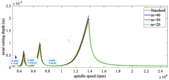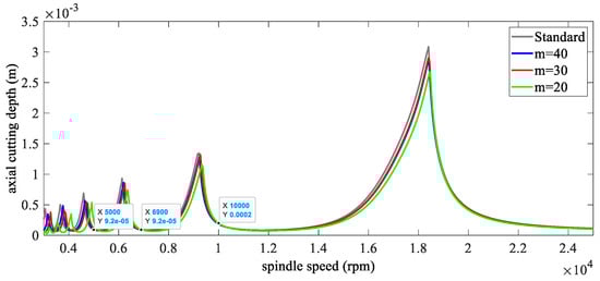 Firstly, the milling parameters are given as: a four-fluted cutter, down milling, the radial immersion ratio is 0.5, the natural frequency is 922 Hz, the relative damping is 0.011, the modal mass is 0.03993 kg, and the cutting force coefficients are and . With , the standard SLD can be obtained as the gray line in Figure 3.