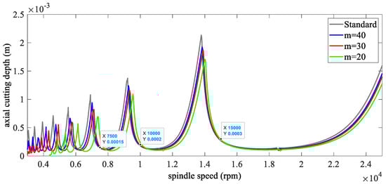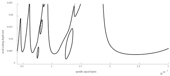To avoid chatter, the milling parameters, such as spindle speed and axial and radial milling depth, should be selected carefully [,]. The selection of these parameters should be based on the characteristics of the workpiece, the cutting tool, and the machine tool being used. A stability lobe diagram (SLD) is an important tool for chatter suppression and can be used as a guide for parameter selection []. It is a graphical representation of the stability limits of a milling process, which can be used to determine the optimal cutting conditions for a given combination of machine tool, workpiece, and cutting tool. By using a SLD, the milling parameters can be adjusted to avoid chatter, which can lead to improved tool life, increased productivity, better surface quality, and higher machining accuracy.