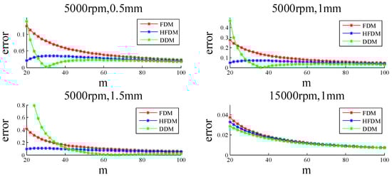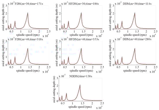 In this section, the SLDs and the elapsed CPU time are obtained for 3000 rpm–25,000 rpm for FDM, HFDM, DDM, and NDDM over a -sized grid of parameters. For reference, the SLD from the SDM with is calculated and presented in grey in each figure as the exact benchmark. From Figure 6, it is seen that the proposed method has satisfactory stability charts and is able to increase the efficiency by 100% or more. For larger discretization interval numbers, NDDM has a much greater advantage.
