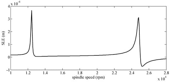 It can easily be shown that the time step will decrease as increases. The smaller the time step is, the better accuracy this method has. The DDM has the lowest suitable spindle rotating speed, . In order to obtain a SLD with enough accuracy for the range of spindle speed, there exists the critical time step, , which stays the same for different milling conditions and is just related to the adopted algorithm. Thus, for a specific , , and , the critical time step, , can be calculated as the following: