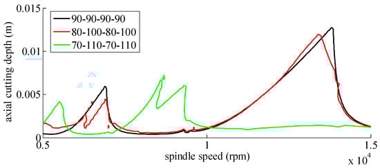 The structural dynamic and operational parameters of the adopted example are: a four-fluted cutter, up-milling, the cutting force coefficients are and , the natural frequency is , the relative damping is , the modal mass is , the radial immersion ratio is , and the pitch angles are , , and . The SLDs can be seen in Figure 10.