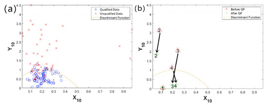 In Figure 5a, the blue “○” points are qualified samples, the red “×” points are unqualified samples, and the orange parabolic curve is the projected discriminant function that divides the sample space into two regions and correctly separates most of the samples.